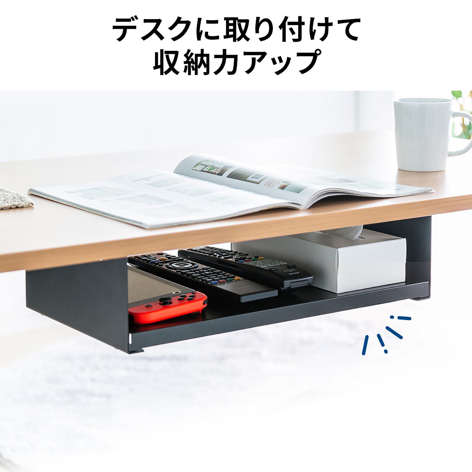 本商品は、デスクの天板裏に木ネジで簡単に固定ができる収納ラック。収納が少ない昇降デスクや在宅ワークでのスペース拡張、リビングデスクでの小物収納などに最適です。