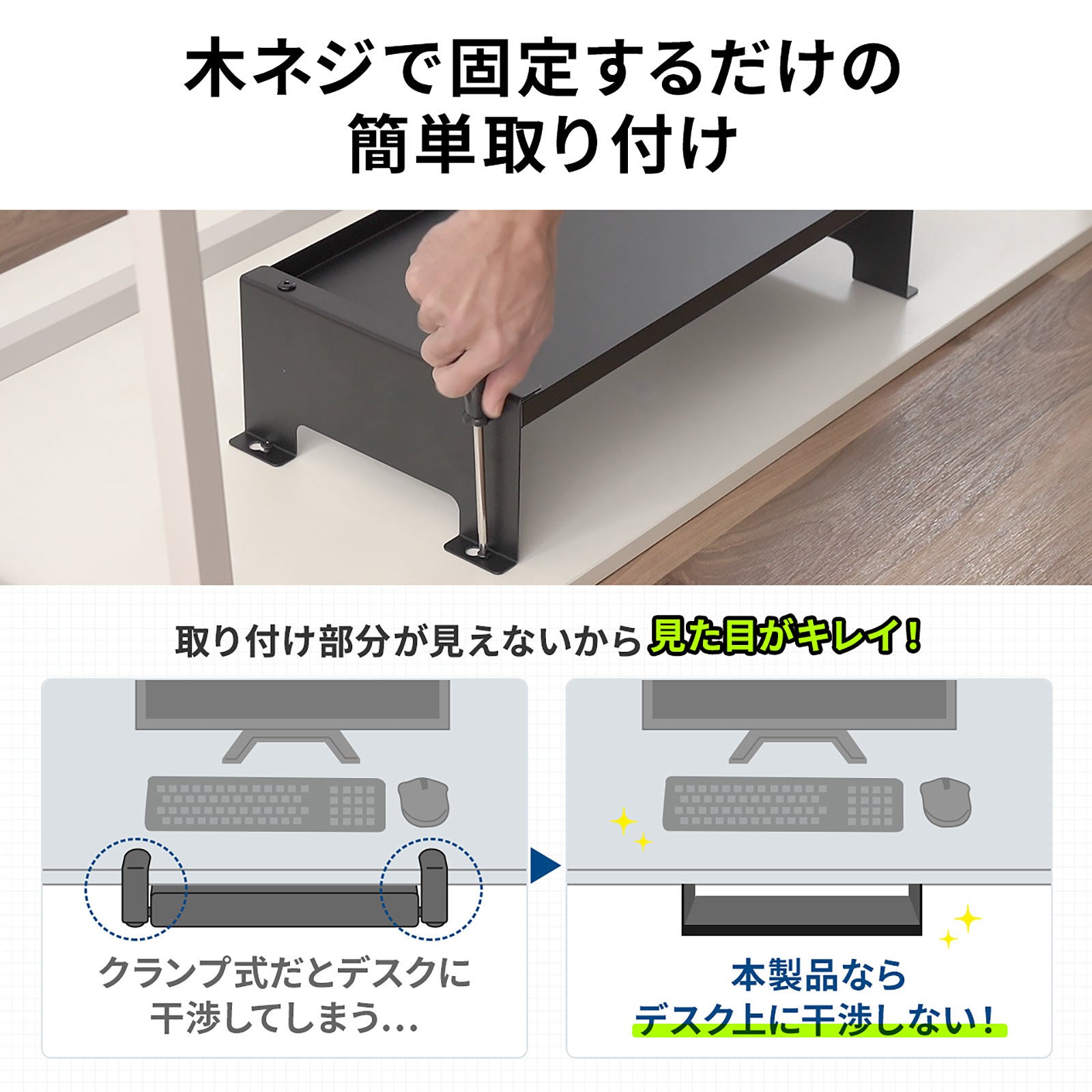 既存のデスクに木ねじで簡単に取り付け可能。クランプ式のようにデスク上に干渉しないため、スッキリとした見た目で作業できます。