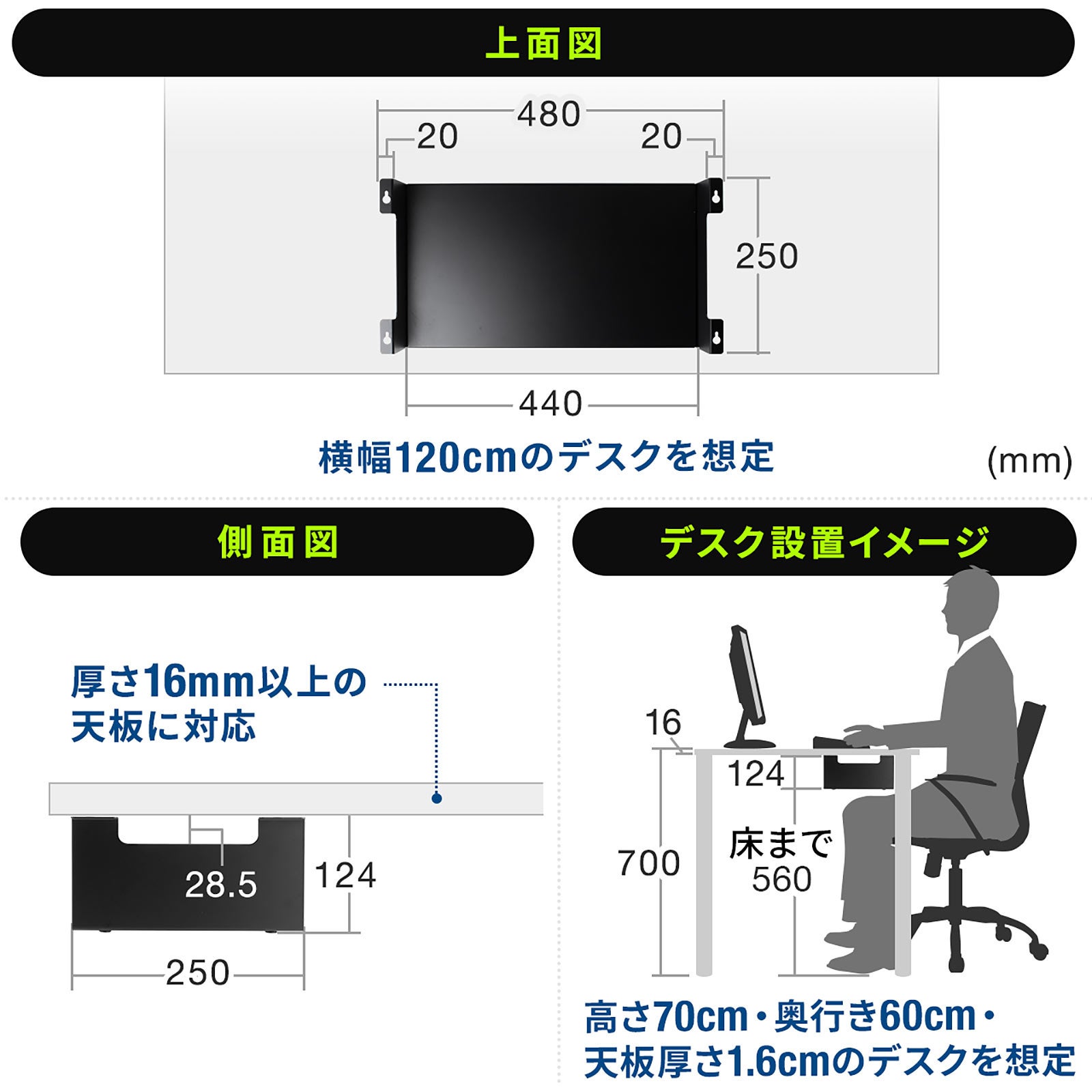 本製品の耐荷重は10kg。サイズは約W480×D250×H124mm、 重量は約1.7kgです。また、天板の厚さが1.6cm以上のデスクに取り付けできます。