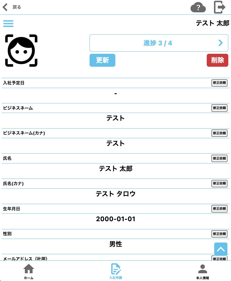 入社申請画面(入社予定者)入社予定者が入社申請や申請内容の修正、必要書類のファイル添付を行う画面です。