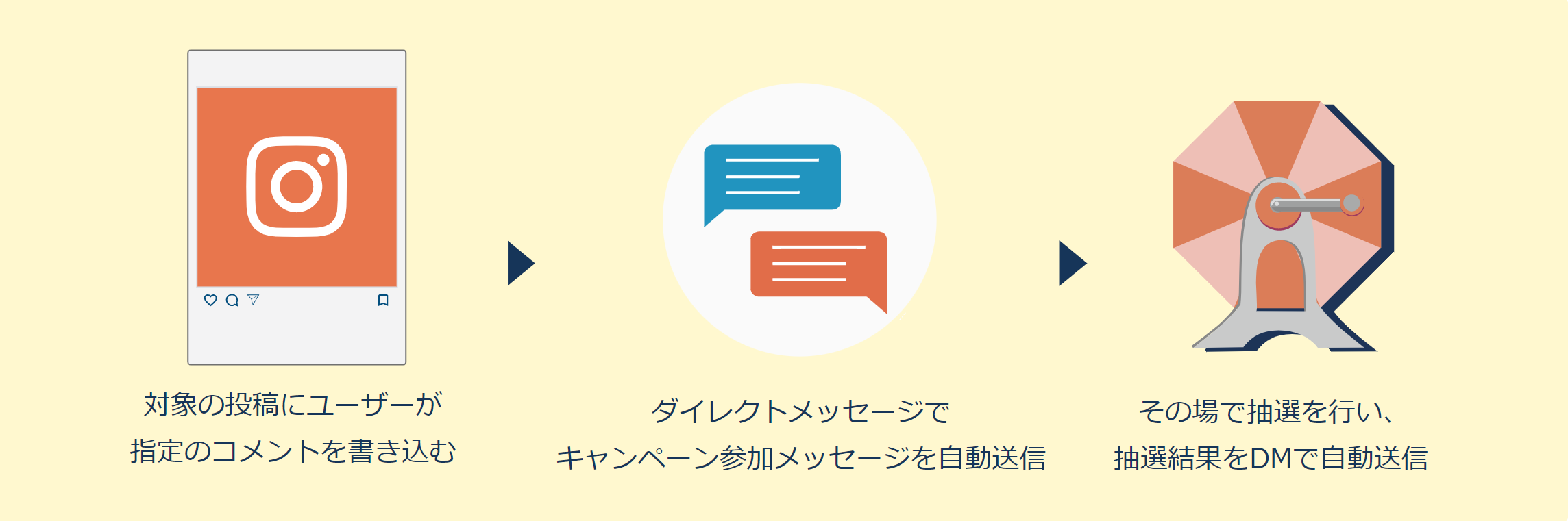 投稿に指定のコメントをしてくれたユーザーに対して即座に抽選結果のDMを送信します。当選者数や当選率などを、事前に設定することも可能です。