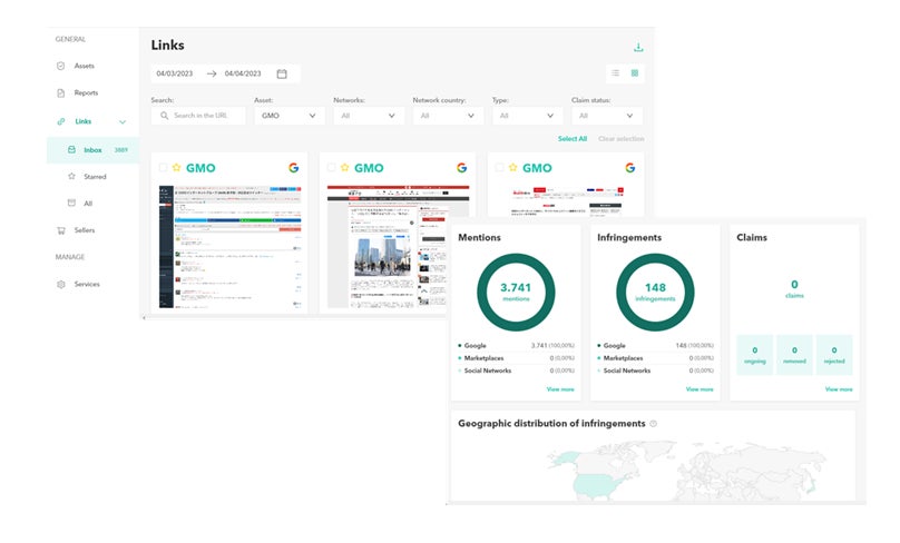「GMOブランドサーベランス」は、ウェブ上のブランド侵害にワンストップで対応可能なサービス。