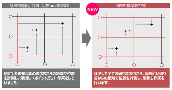 機能強化されたSumiROBOでは、複数の通り芯(壁や柱の中心を通る線)設定により、測量機の設置位置(器械点)を特定する作業を、墨出しする墨点の位置に合わせて、最も近い通り芯や既知点に自動で切り替える墨出し方式へと変更しました。