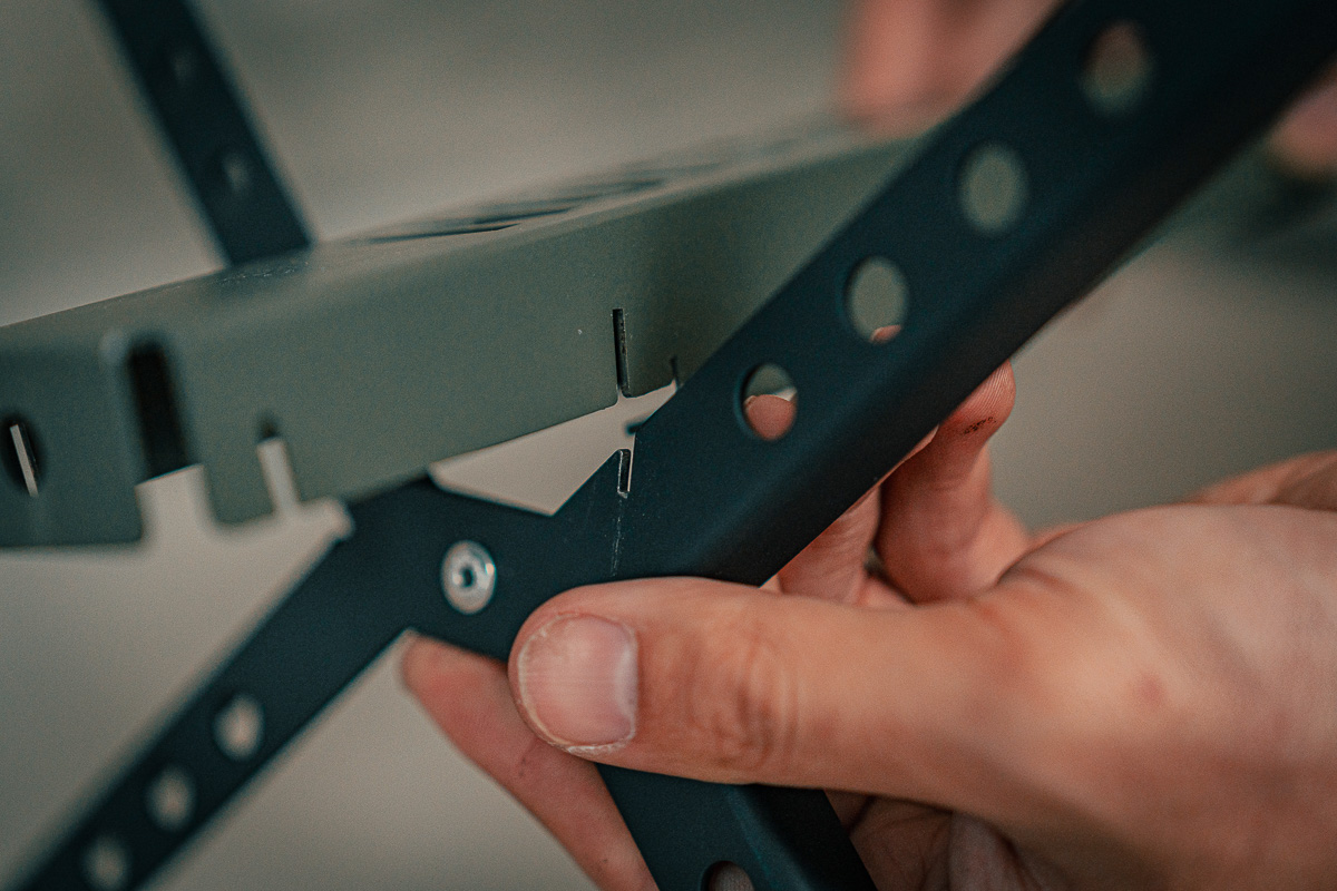 パーツは左右の脚部となる2枚のクロスプレートとこれらを繋ぐジョイントプレートの3点で、使うときは2枚のクロスプレートをそれぞれ十字型に広げてジョイントプレートのスリットに差し込めばOK。