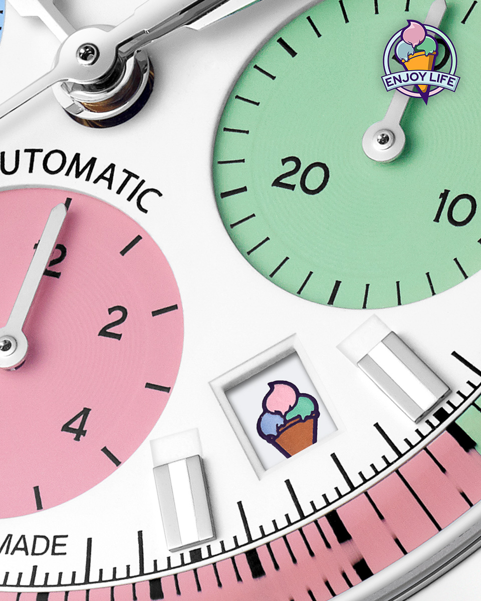 さらに、3つのサブダイヤルと外周リングには、ピンク・ブルー・グリーンの爽やかなカラーを配色しています。ジェラートのようにキュートな色使いが、心躍る夏のムードを演出してくれます。