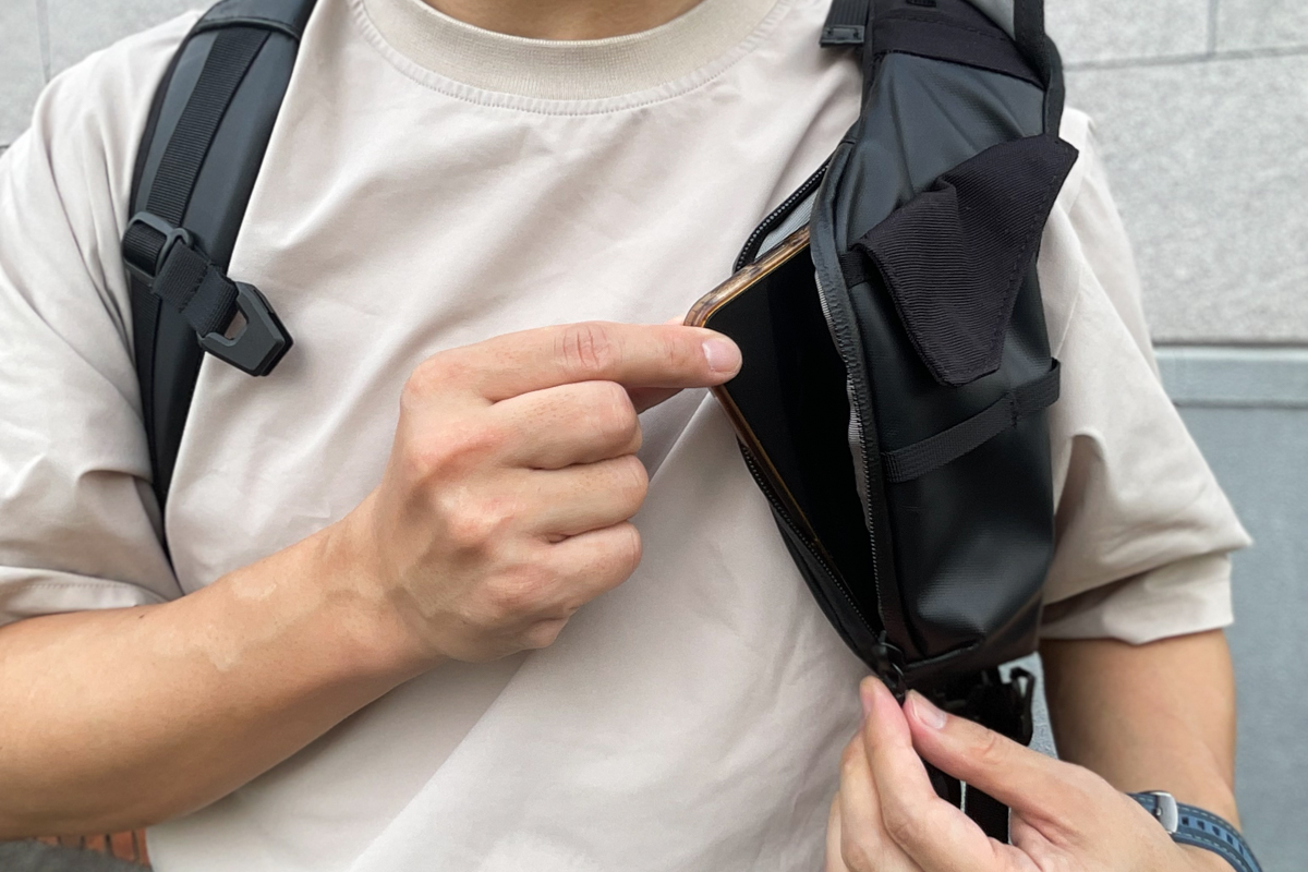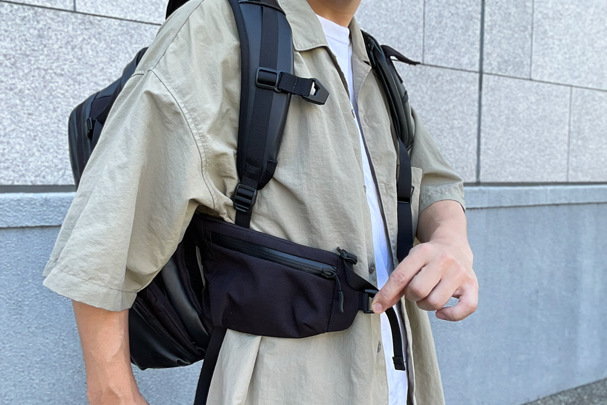 特に驚いたのが、背中の腰あたりに隠された可動式ポーチ。普段はバッグ内部に収まっていますが、必要なときにスッと引き出せるんです。
