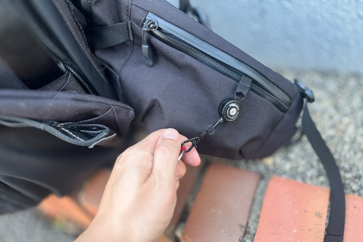 ポケットの中には、伸びるキーリールも搭載されています。バッグを背負ったままでも鍵をサッと伸ばして玄関を開けられるから、「あれ、鍵どこだっけ?」とゴソゴソ探さなくていいのがラクなんです。