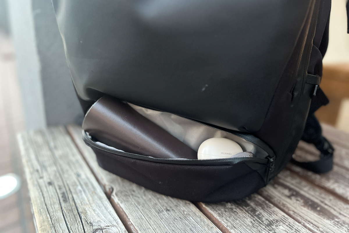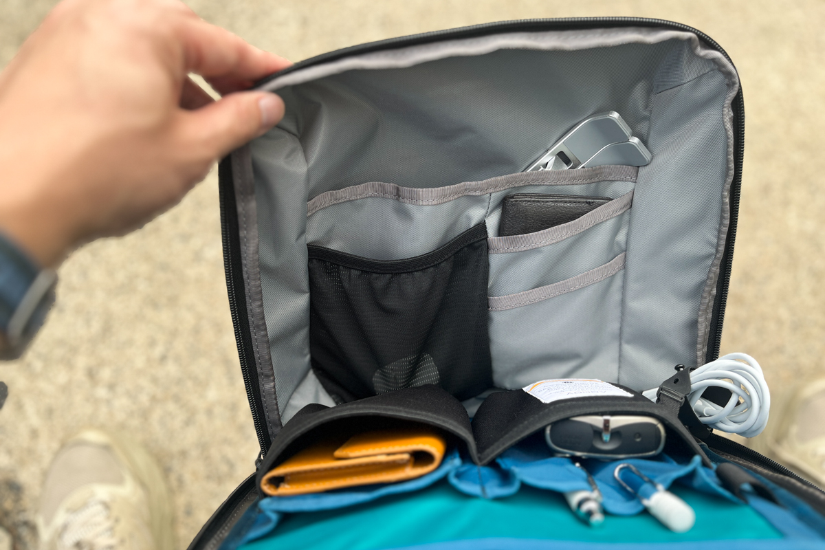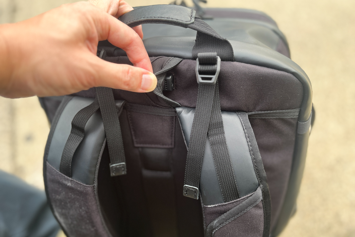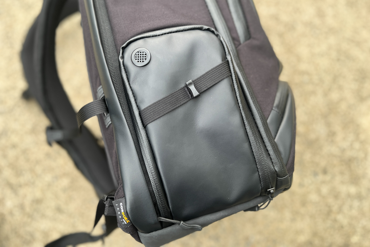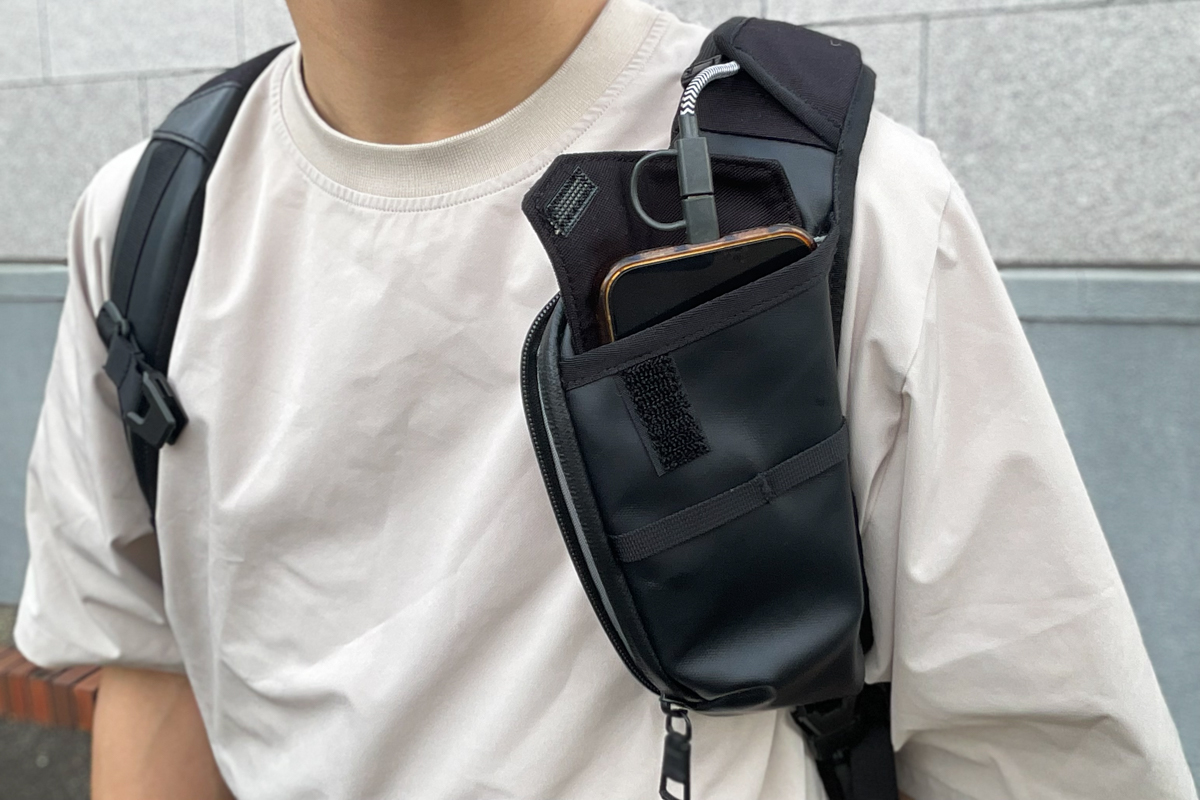 このバッグは、収納力だけでなく、旅を快適にしてくれる仕掛けも随所に盛り込まれています。たとえば背負ったままスマホを充電できる点。