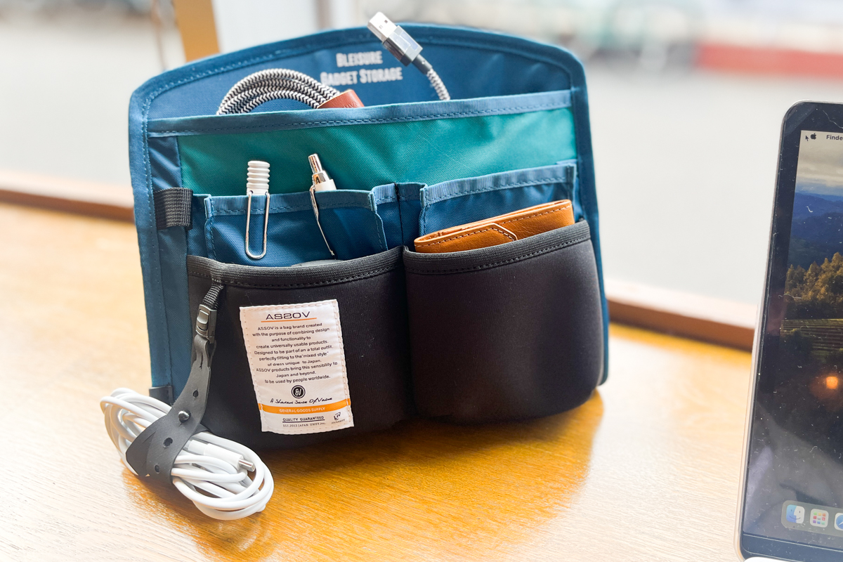 PC周りのアクセサリーやケーブル類をまとめて入れておけば、そのままテーブルに立てて使えるんです。ホテルやカフェでつい散らかりがちなアダプターや充電器も、これならスッキリ整理可能。