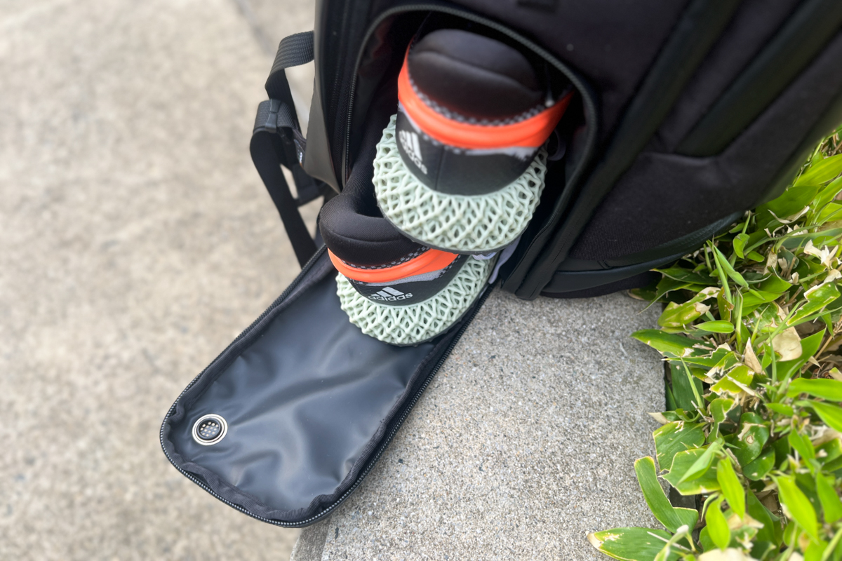 ▲バッグのサイドポケットからシューズを収納可能
