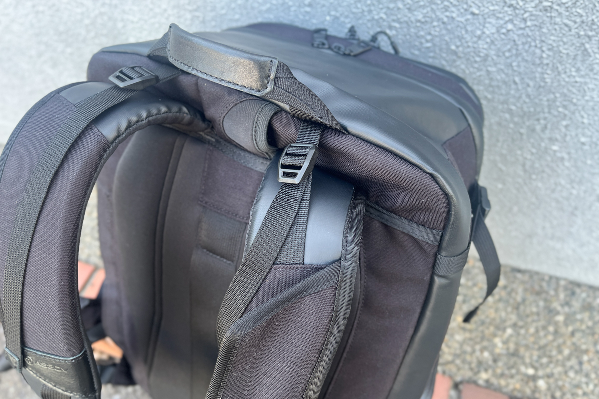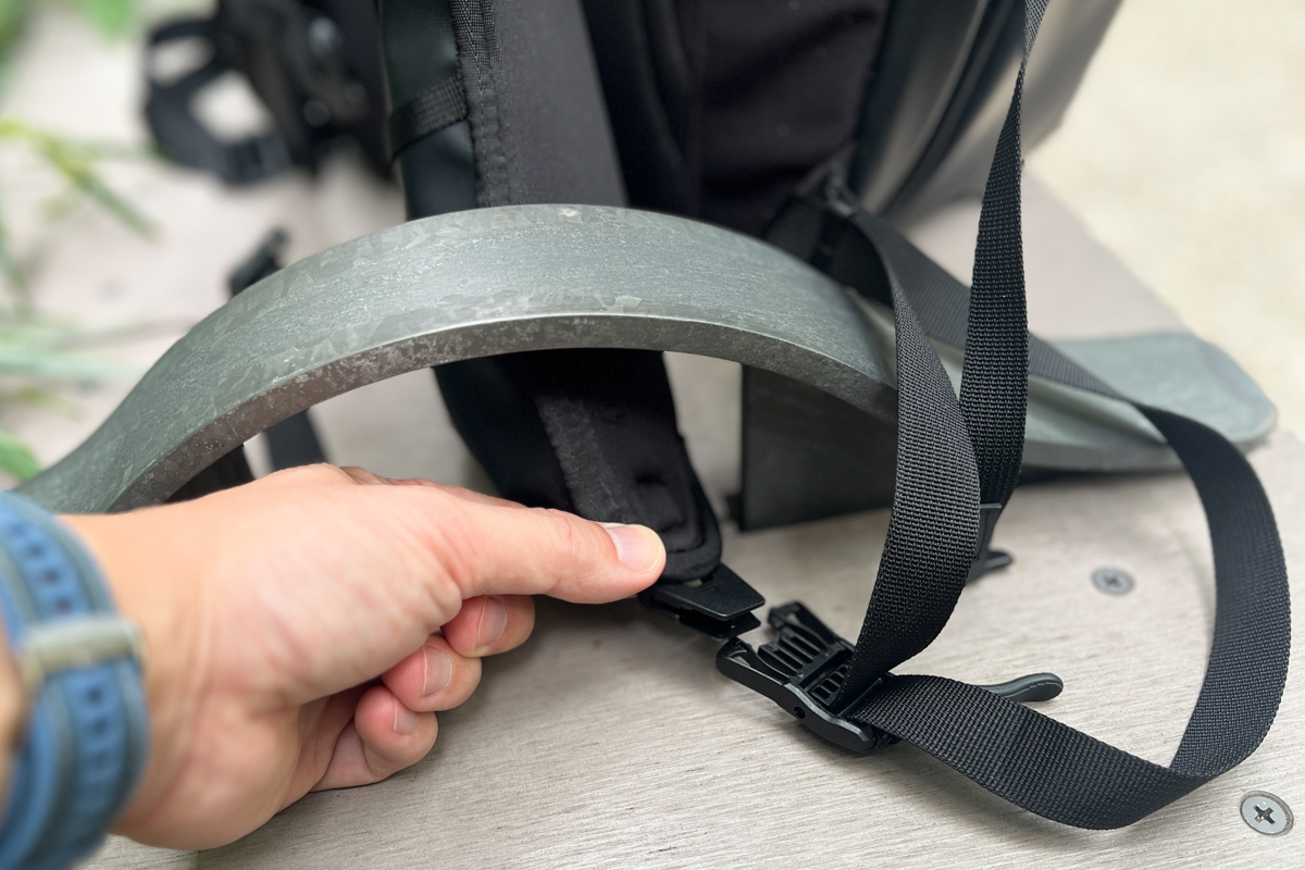 厚みのあるショルダーストラップが肩への食い込みを防ぎ、長時間の移動も快適。さらに、バッグ上部の荷重を背中側に引き寄せるロードリフターを備えているので、安定感も高まります。チェストストラップはワンタッチで着脱でき、装着もスムーズです。
