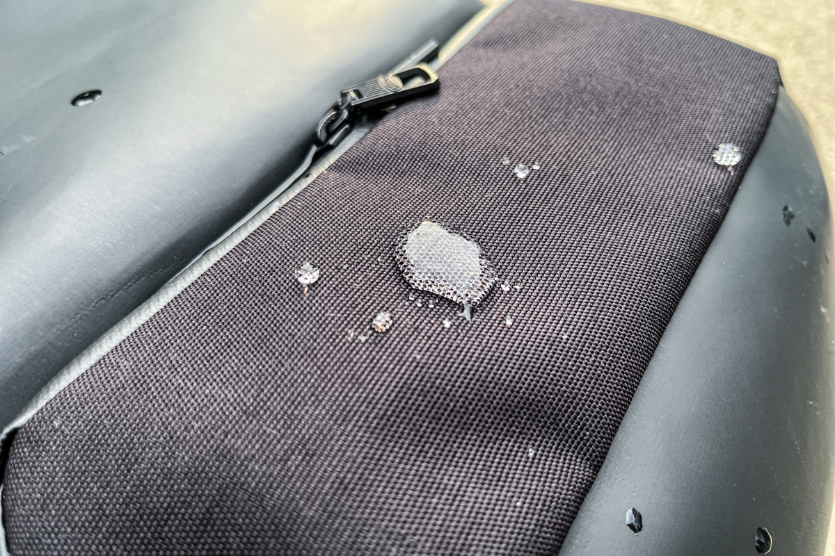 このバッグの大きな魅力のひとつが「雨への強さ」です。AS2OVオリジナルの高撥水素材を巧みに組み合わせ、ツルッとしたゴムのような質感の“600D POLYCARBONATE”と、風合いのある“500×840D CORDURA NYLON 3LAYER”を配置。異素材のバランスが効いていて、デザイン性を損なわずに雨をしっかり弾いてくれます。