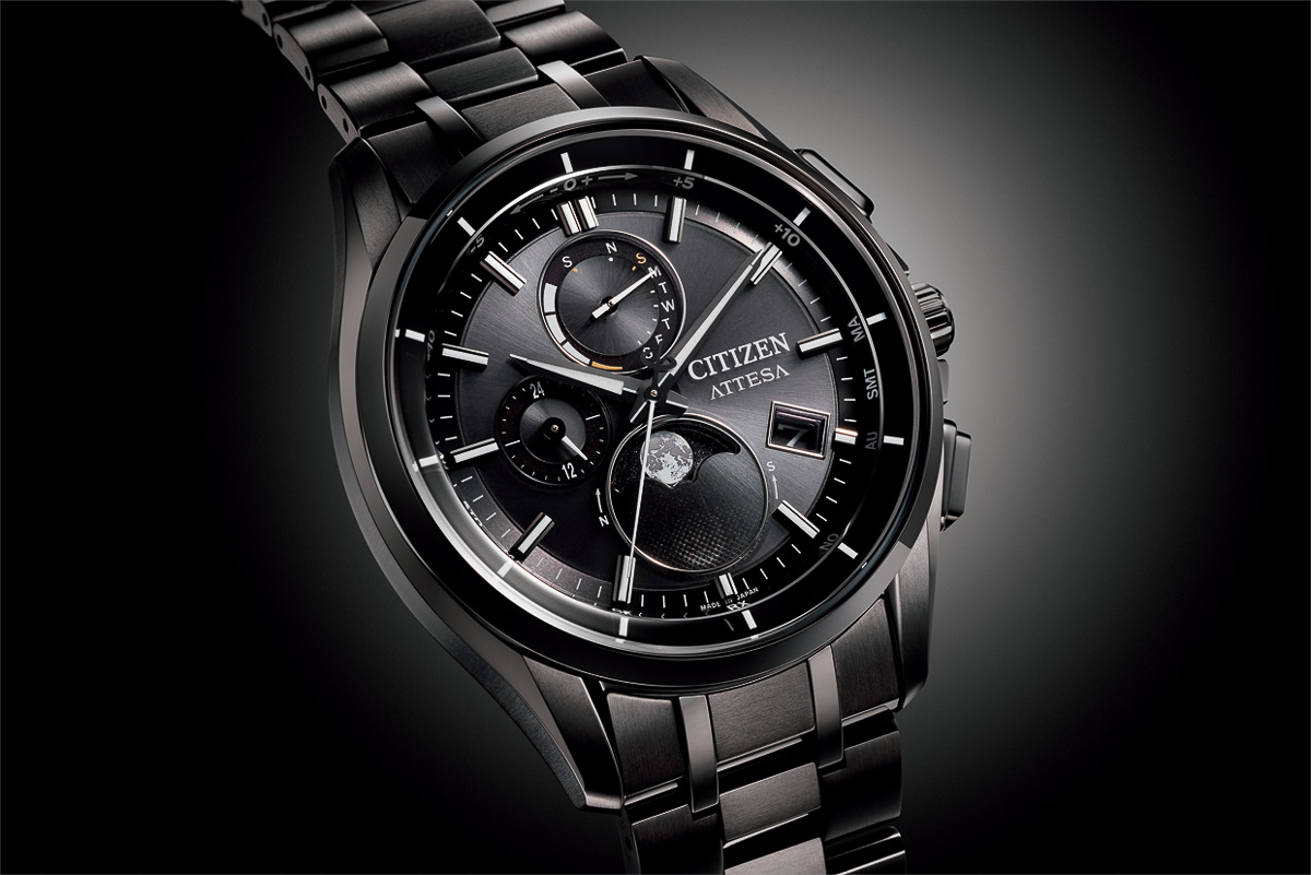 薄型で美しいブラックチタン製ボディで軽さと堅牢さを両立したエコ・ドライブ電波時計。アナログ式光発電腕時計で世界初となる月齢自動計算機能「ルナプログラム」を搭載し、北・南半球の月齢表示切替機能「NSシフト」も備える。ケース径41.5mm、100m防水。