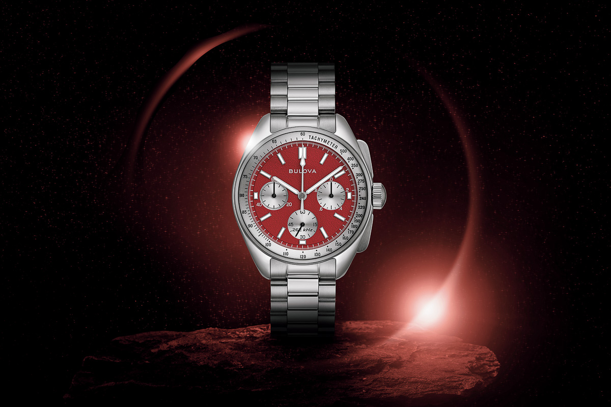 1971年にアポロ15号が月面着陸に成功した際、船長が月面で使用した「ルナ パイロットクロノグラフ」のオリジナルデザインを忠実に再現。本カラーは皆既月食の赤い輝きを表現した新色。月差±5秒の高精度ムーブメントを搭載する。ケース径43.5mm、50m防水。