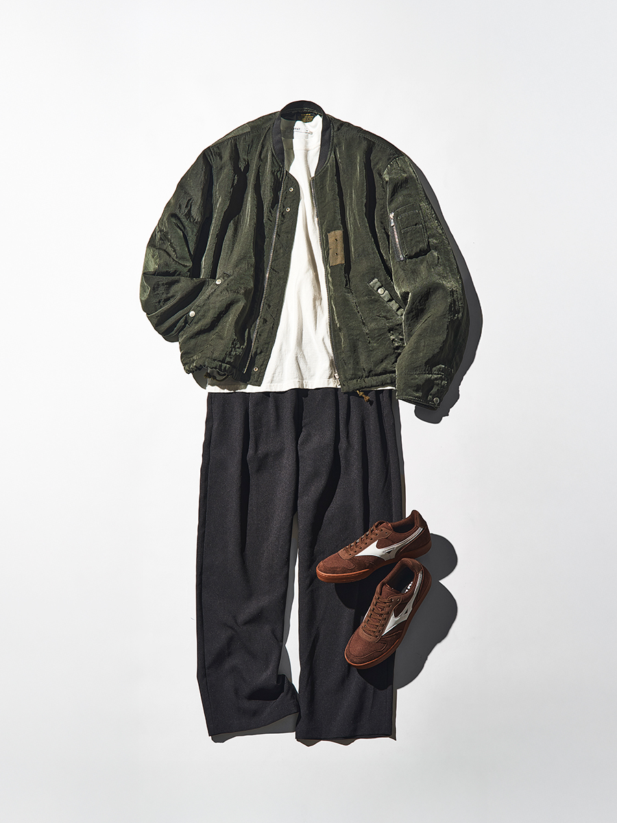 MA-1などのミリタリーアウターやハンティングジャケットなど秋冬は大人が好む渋さのあるアウターが活躍する季節。足元を含め、その他のアイテムをきれいめにすることを心がければそれだけで落ち着いた大人の姿を演出できます(スタイリスト深澤勇太さん)