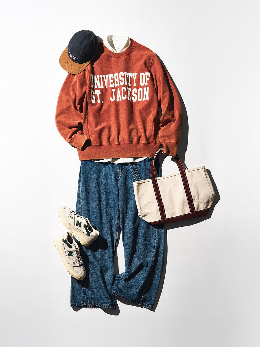 カレッジロゴのスウェットにウォッシュの入ったデニム、そしてローテクのコートシューズ。まさに王道のアメカジスタイルです。ただ、王道だからこそちょっとした工夫で一気に洒落感はアップするもの。そこで意識してほしいのが清潔感。白×グリーンという爽やかな色味のスニーカーを選んだり、スウェットの下にシャツを仕込んだりすることでクリーンな印象を呼び込めます。