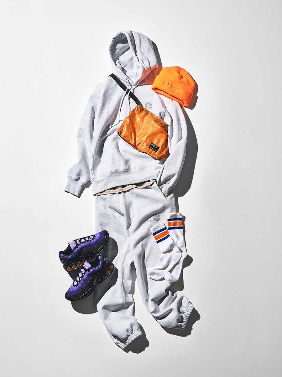 ▲スニーカー1万8700円/ナイキ スポーツウェア(ナイキ カスタマーサービス)、パーカ1万3200円、パンツ1万3200円/ともにワッツアップ(ワッツアップ)、Tシャツ4400円/リーバイス(リーバイ・ストラウス ジャパン)、ニットキャップ4950円/エル・エル・ビーン(エル・エル・ビーンカスタマーサービスセンター)、バッグ4730円/オーバーラボ(キャビアプロダクツ)、ソックス1474円/ユナイテッドアスレ(キャブ)