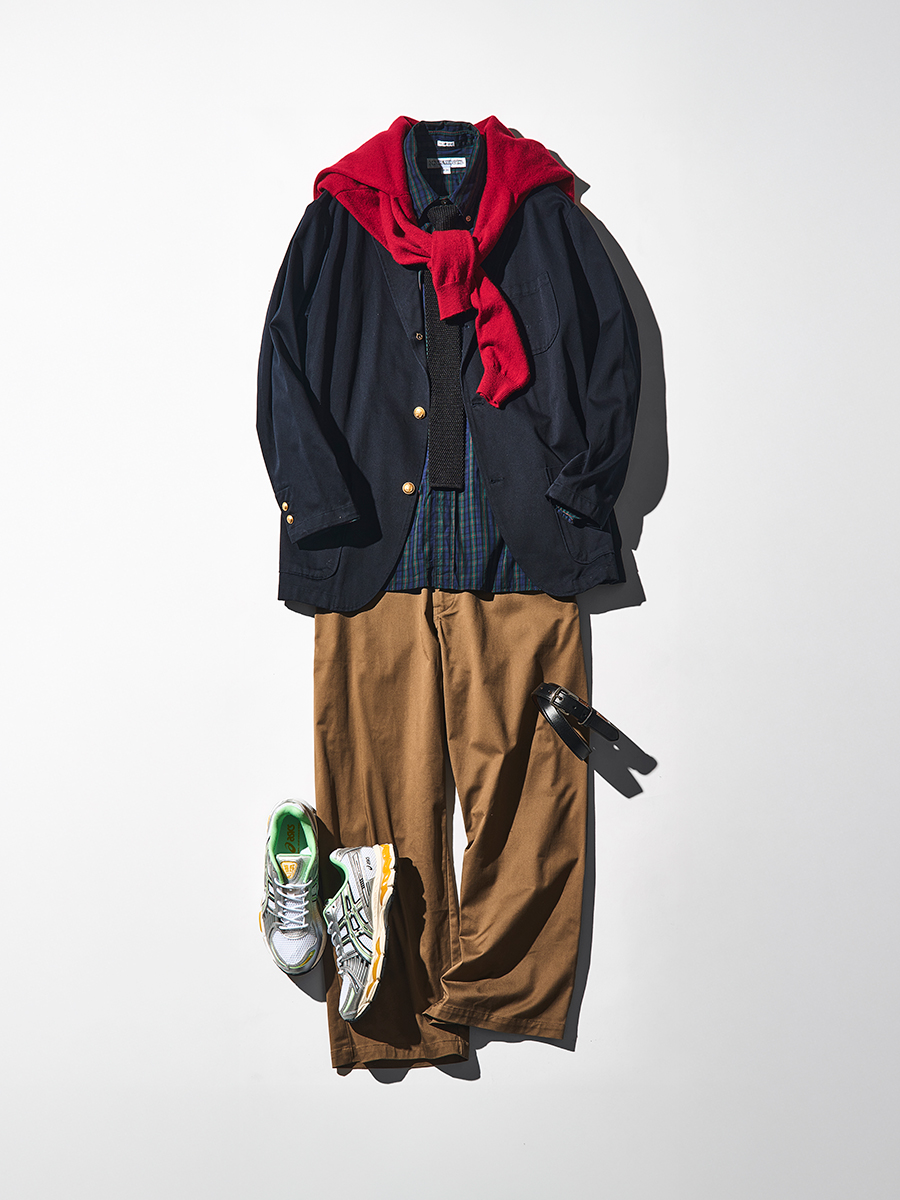トラッド一辺倒ももちろんかっこいいのですが、個人的には足元はハズシていたほうが程良く力が抜けていて大人な着こなしだなと思います。トラッドなアイテムは基本的にベーシックなデザインのモノが多いので、ハイテクスニーカーとの対比でお互いを引き立てられるのもおすすめしたい理由ですね(スタイリスト深澤勇太さん)