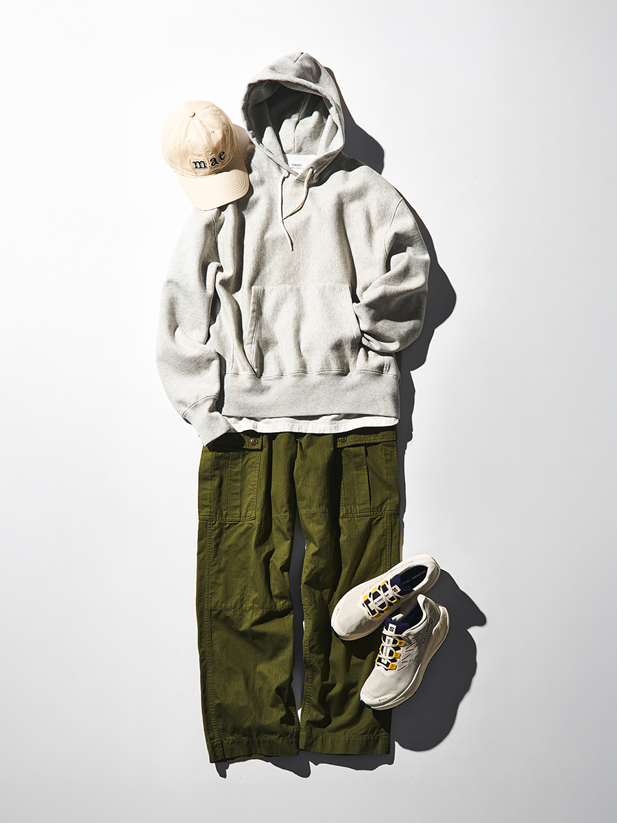 カーゴパンツには黒などの重たいカラーのシューズを合わせる人も多いと思います。それも間違いというわけではないのですが、トップスや小物などもダークトーンだったりすると野暮ったくなりがち。スニーカーというよりも全体のバランスを取る小物、という感覚で合わせるとイメージしやすいと思います(スタイリスト深澤勇太さん)