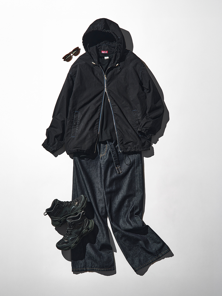 ▲スニーカー3万5200円/メレル(丸紅コンシューマーブランズ)、ジャケット7万1500円/ディーゼル(ディーゼル ジャパン)、Tシャツ2255円/ユナイテッドアスレ(キャブ)、パンツ1万7600円/リーバイス(リーバイ・ストラウス ジャパン)、サングラス9000円/オンデーズ(オンデーズ)