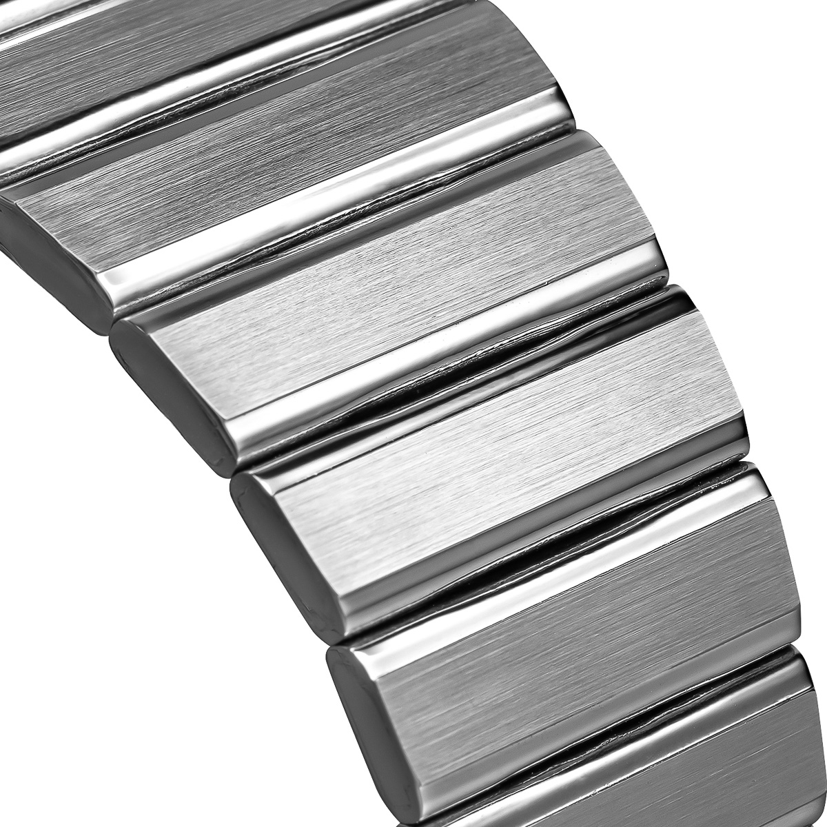 付属のブレスレットはステンレススチール製。19mmのラグ幅に合わせた堅牢な作りで腕のサイズにかかわらずしっかりと沿い、快適な付け心地をサポートします。