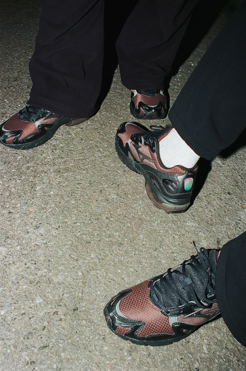 ブラックやブラウンなどのダークトーンでまとめられたデザインは都会の無機質な風景がコンセプトに。よく見るとアッパーはディテール毎に微妙な配色の変化や異なる素材が使われており、刻一刻と表情を変える都市の風景を表。アスファルトに滲んだオイルが反射するように七色に輝くヒールのリフレクターはデザインのアクセントになっています。