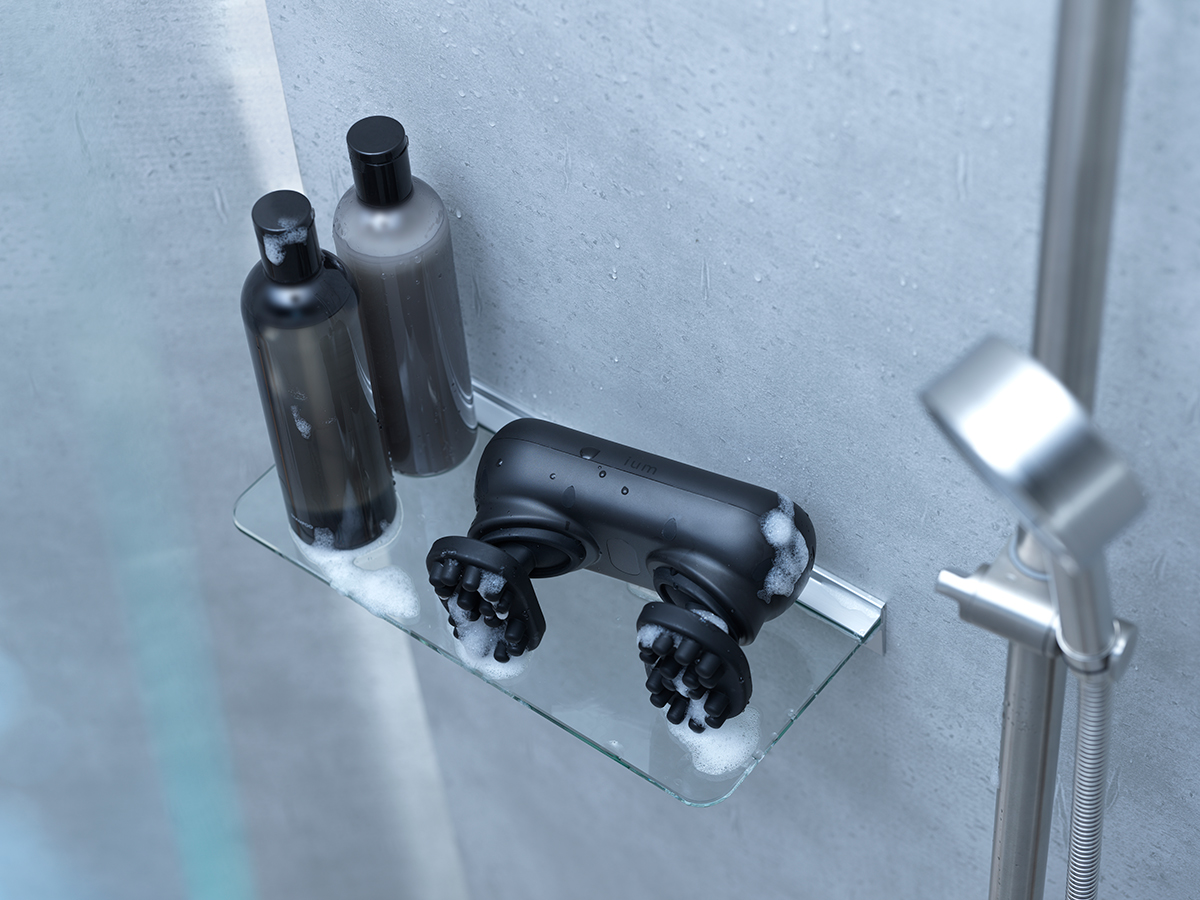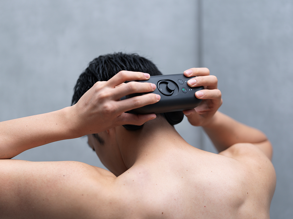 また、両手でも掴みやすいように長方形にしているそうで、上の写真のように両端を持って首裏に当てればマッサージガンのように首の凝りをほぐせます。実際に使用してみると“痛い”と“気持ち良い”の絶妙なバランスで、人から揉まれているような力強さを感じられるはず。ちょうど頭蓋骨と首の境目辺り(後頭下筋群)をグリグリ・ゴリゴリとほぐしていく感覚は、一度味わうとやみつきになること間違いありません。ずっとこの痛気持ち良さが続けばいいのに…といつものシャワータイムが極上のマッサージタイムへと早変わり。