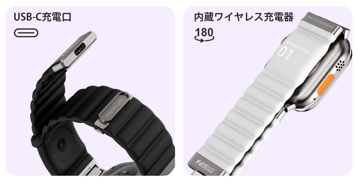 カラーはブラック・ホワイト・オレンジの3色で、サイズはMとLの2種類。Apple Watchの充電を、もっとシンプルに、もっとスマートに。「NEXXT PERCENT Pro」は、Apple Watchの小さな“面倒”を軽やかに解決してくれる1本です。