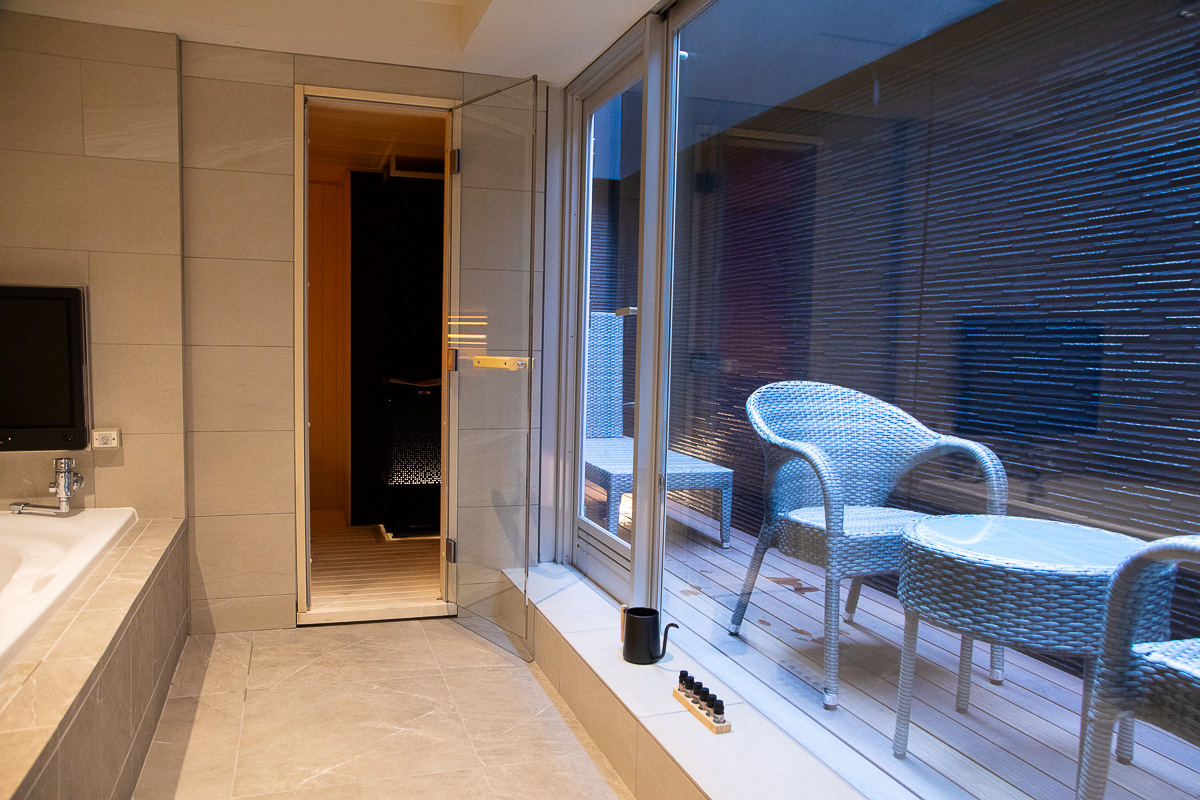 全室スイート級の和モダンホテルで、セルフロウリュウが楽しめるドライサウナ、広々とした浴槽、オーバーヘッドシャワー付きの浴室を全室に用意。