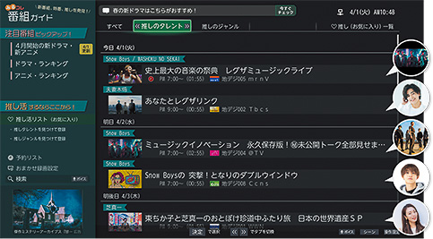 AIが出演者やジャンルの好みを分析し、あなた向け番組を一覧表示。録画は早見再生が可能で、スマホアプリ「どこでもディーガ」を使った外出先での視聴や、別室のテレビへ転送しての視聴も可能。