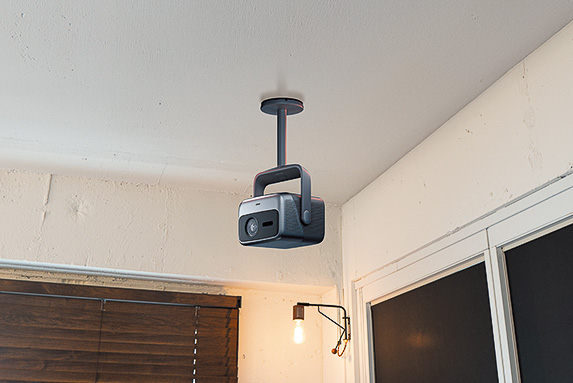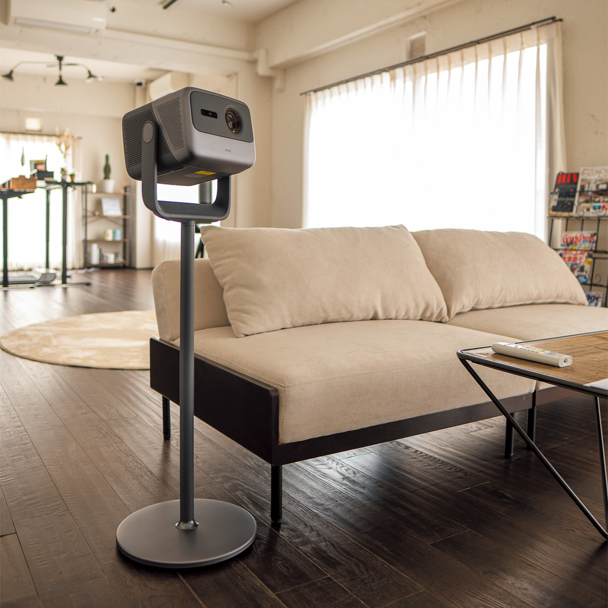 上下左右に自由に動くジンバル一体型スタンドで天井投影も簡単。壁スイッチを避けて映像を投影する補正機能、壁色に合わせて色味を調整するのも全自動です(本間さん)