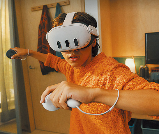 Meta Quest 3Sは、コスパ優秀な複合現実ヘッドセット。バーチャルオブジェクトが部屋の中に高解像度で再現され、ゲーム、エンタメ、ソーシャルエクスペリエンスからフィットネスまで現実を超えた世界を観ることができる。
