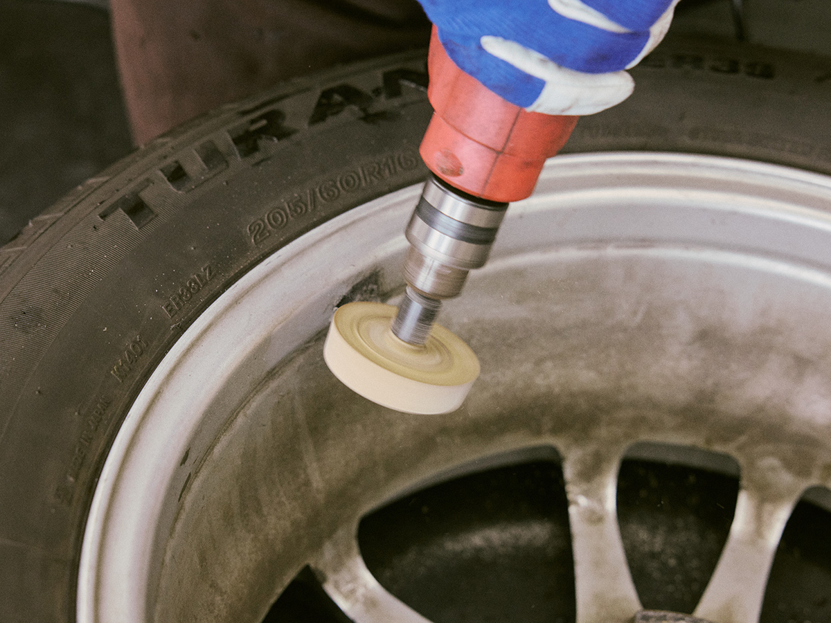 続いて古いバランス調整用のオモリを丁寧に取り外します。シール糊まで細かく綺麗に落としている様子。