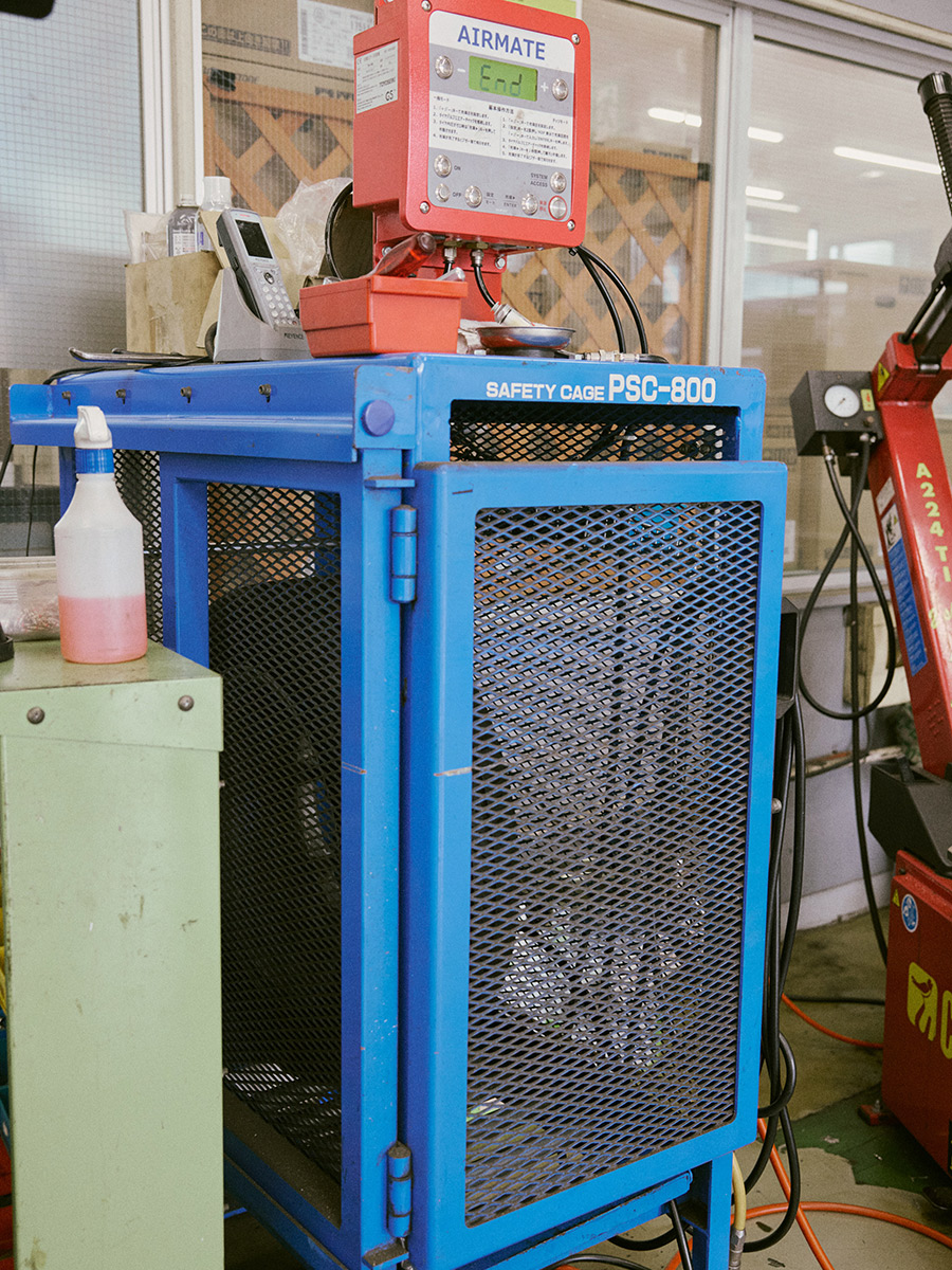 組替専用の空気入れ。膨らむ際にホイールの淵に強い勢いでぶつかり、大きな音が響く。