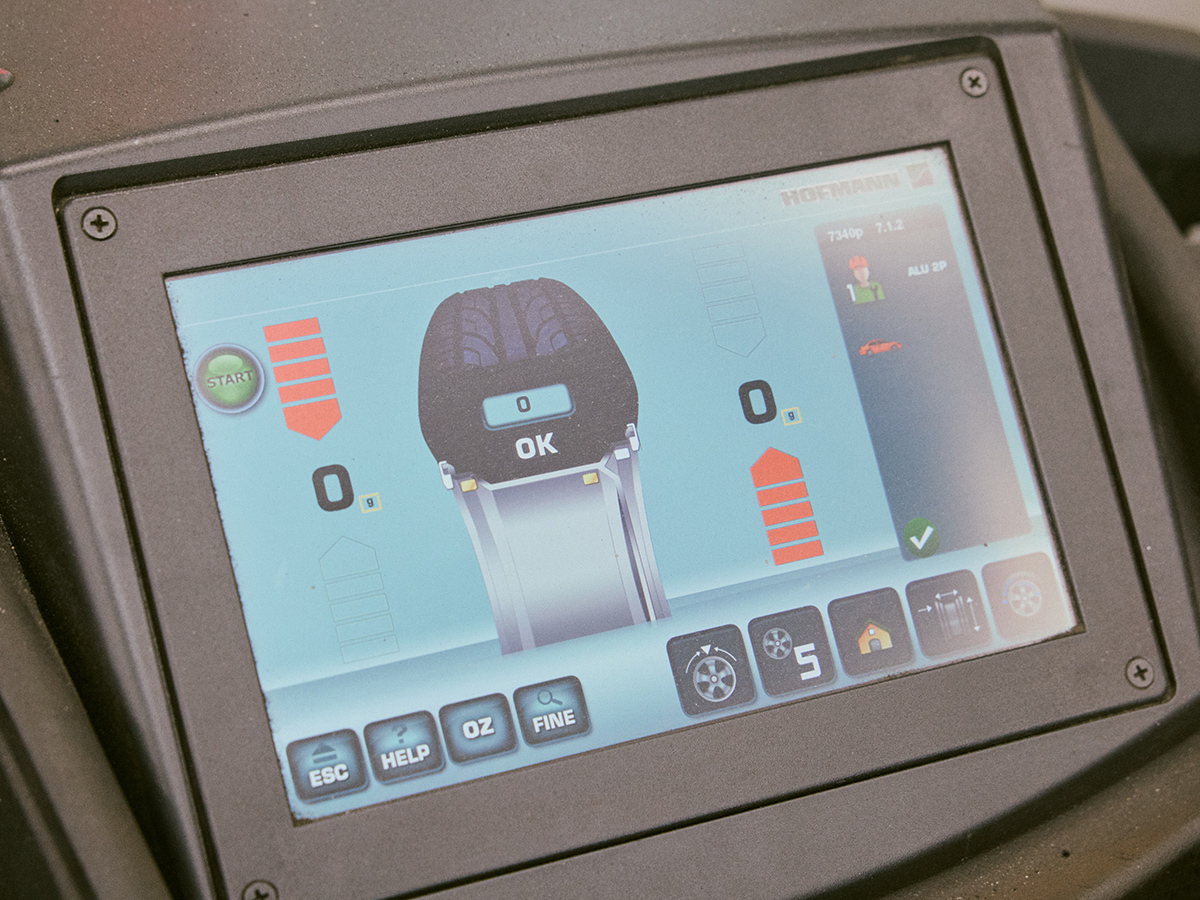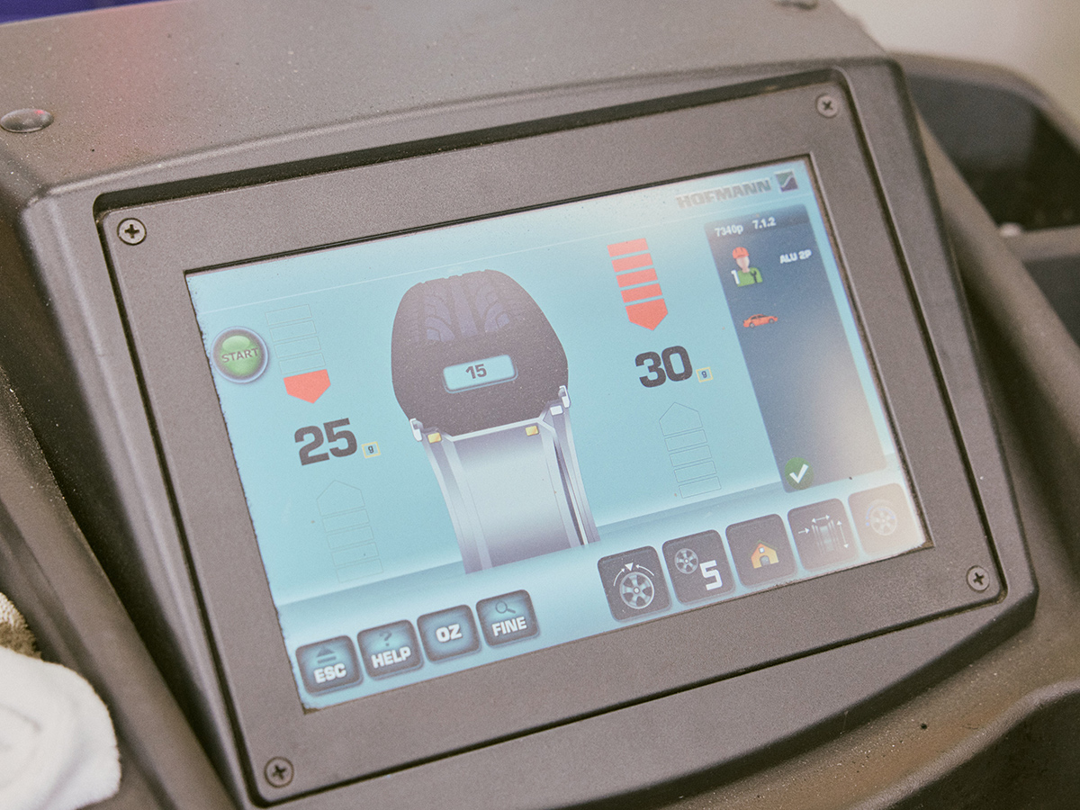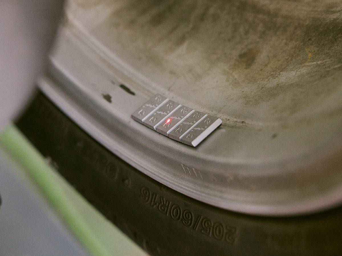 適正の空気圧になったらバランス調整へ。タイヤを進行方向へと回転させながら偏摩耗を防ぐために左右のバランスを見ています。