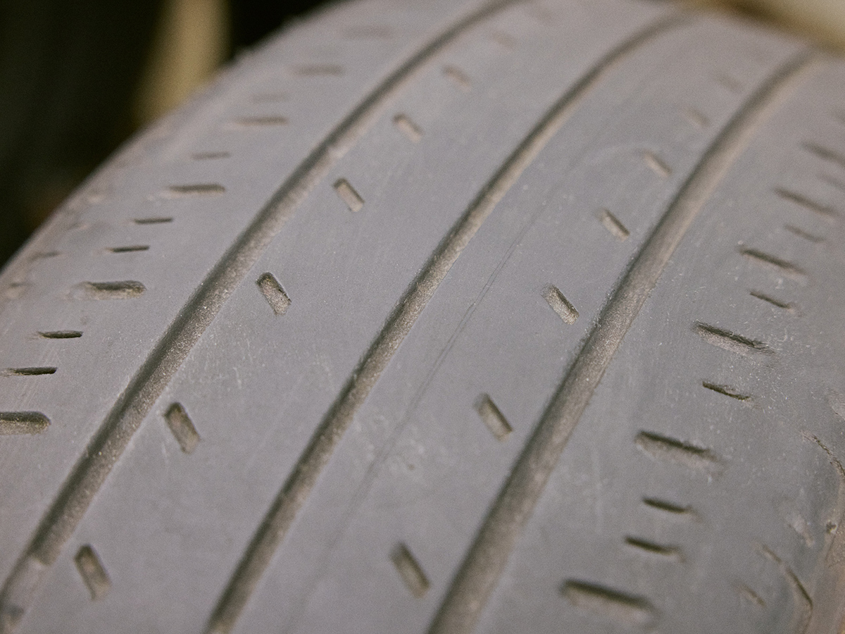 ▲全体的にタイヤの摩耗が進み、溝が浅くなっている状態。雨を逃すための溝が浅くなることでスリップなどの危険性が高まるおそれも