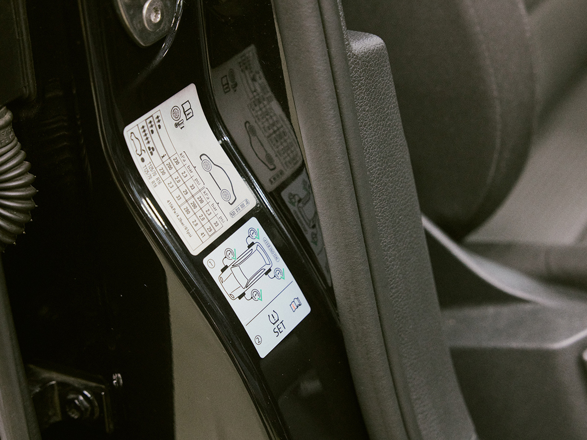 ▲多くのクルマの規定空気圧は運転席側のドア横にラベリングされています