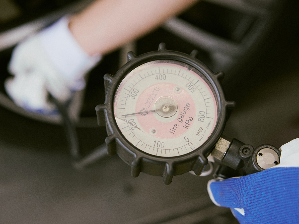 まずはタイヤの空気圧を気にかけるところから始めましょう。車種によって指定圧があるのですが、それを理解して定期的に空気圧をチェックしてください。可能であれば最低でも1か月に1度。また、長距離運転の前も欠かせません。空気圧が適正でないとタイヤの偏摩耗に繋がりますし、特に基準値よりも下がった状態で高速走行するとスタンディングウェーブ現象というタイヤが波打ってしまう状態に。最悪の場合バーストする危険性もあるので注意が必要です。