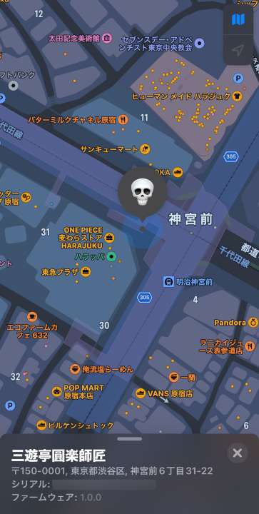 ためしに、東京は原宿付近の表参道交差点にある東急プラザ原宿「ハラカド」前で「探す」アプリを起動し確認してみました。