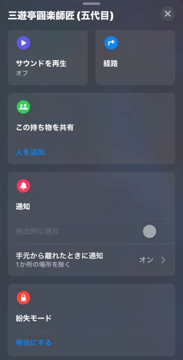 さて、コチラの「紛失防止タグ」、機能的にはマップで現在地を確認が可能。「探す」アプリを起動させ、「持ち物を探す」をセレクトすると、登録された「紛失防止タグ(三遊亭圓楽師匠(五代目))」がつねに表示されているので名前をタップすると、現在位置がマップ上に表示されます。