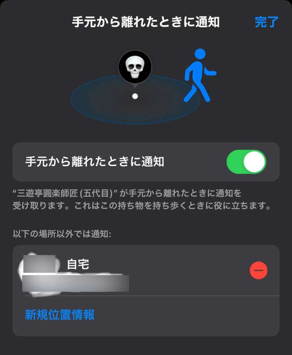 ▲「手元から離れたときに通知」をオンにしておけば、ある程度の距離で自身のスマホに通知がくる設定に