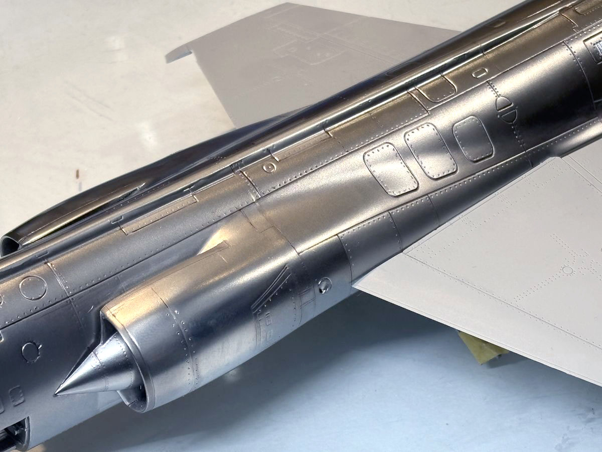▲エアブレーキから後ろの胴体外板がエンジン熱でやや茶色がかっているのがF-104なので、調合した焼色で丁重に塗り分けている
