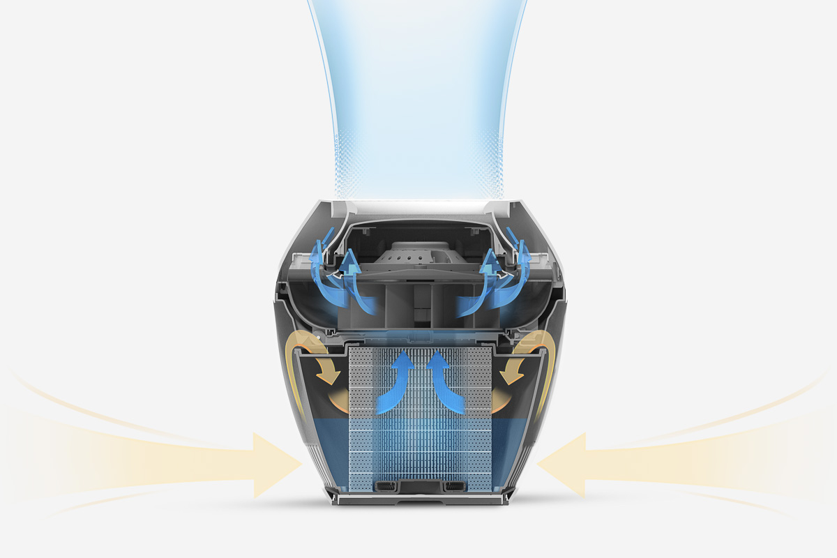 本体上部の縁部分には、シンプルな操作パネルを配置し、スワイプ&タッチするだけでモード選択や風量調節が可能。また新たに“Ambient”のボタンも追加されていて、優しく押せば即座に癒し系の新機能「Ambient Time」モードに。こちらは、高精細ディプレイとスピーカー、LED照明を搭載した新モデルだからこそ成せるワザ。