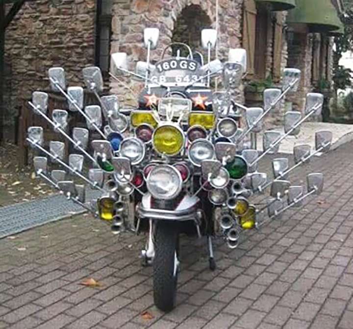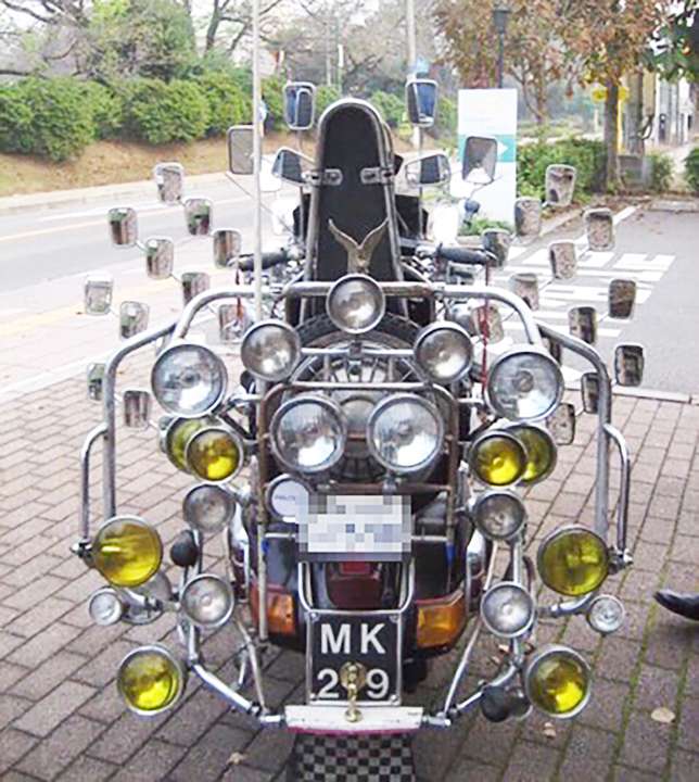 50ccのいわゆるスモールボディモデル。関根さんが高校生だった90年代前後の新車価格は34万円ほど。このバックミラー、ライトなどのデコレーションは、1960年代のイギリスの若者の間で広まったモッズカルチャーのスタイルを踏襲したもの。