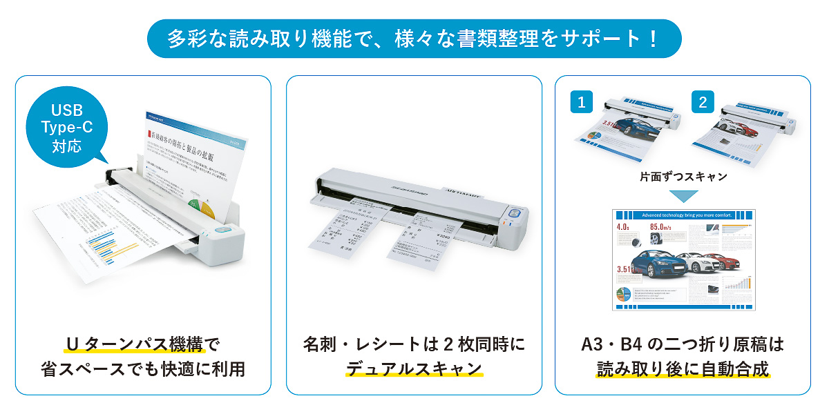 読み取りはA4、A5、A6、B5、B6とさまざまなサイズの書類をカバーしているほか、はがき、名刺、診察券などのプラスチックカードにも対応。A3やB4サイズの大きなサイズの書類や資料もふたつ折りにしてスキャンすれば自動で1枚のデータに合成してくるのでそのまま活用できます。