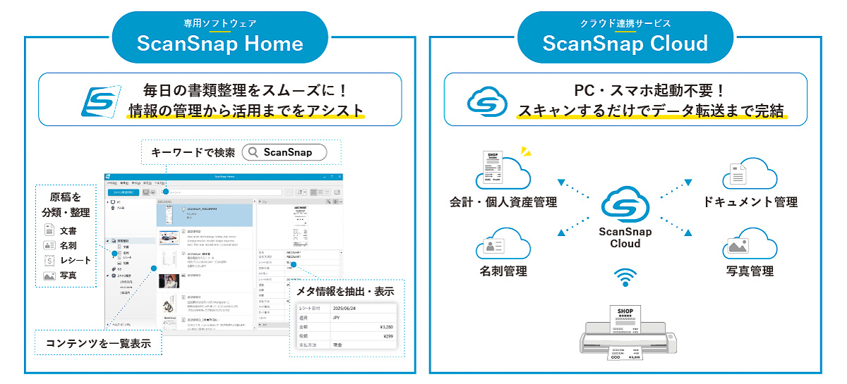 また、注目したいのが直接各種クラウドサービスへスキャンデータを送信してくれる「ScanSnap Cloud」。例えば、レシートをスキャンした場合は会計系のクラウドサービス、名刺をスキャンした場合は名刺管理のクラウドサービスへ自動でデータを振り分けて保存してくるため作業効率は大幅にアップするはず。