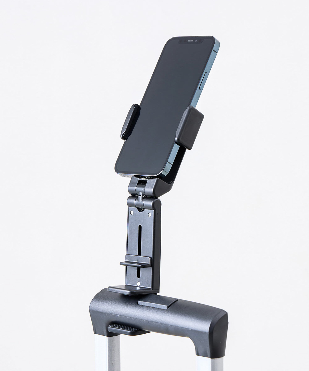 キャリーケースや飛行機のデスクに付けることができ、待ち時間や移動時間の動画鑑賞で活躍。上下左右に360°、前後に310°回転し、見やすい角度にホルダーを調整できる。