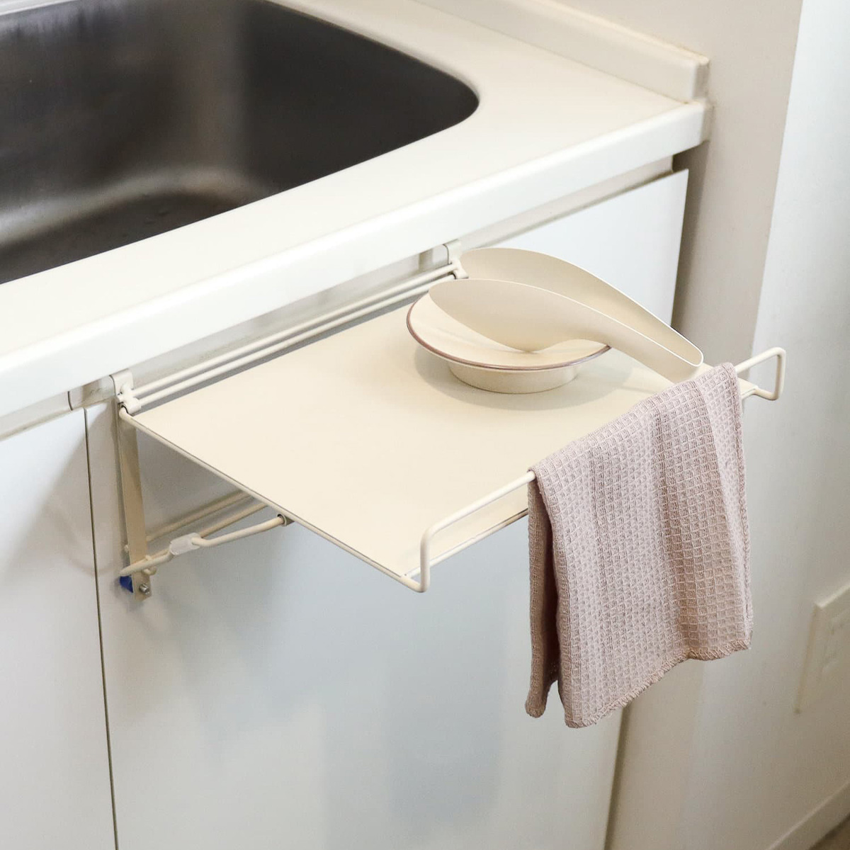 キッチンのスペースが限られるご家庭には必須のサポートテーブル。耐荷重は約1kgで、料理を盛り付ける前の食器を置いたり、タオルをかけたりすれば、毎日の料理がグンとはかどる。