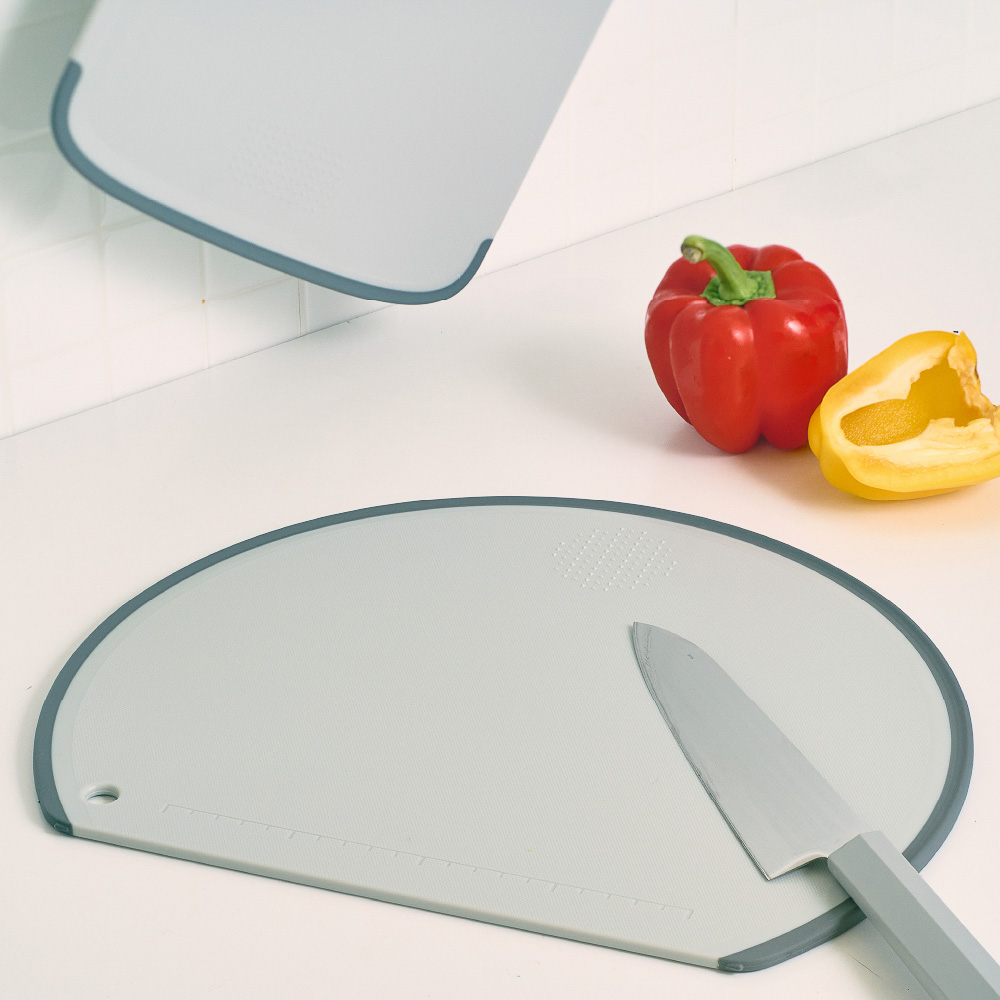 薄くて滑りにくく、安心して使えるD型のまな板。カットした食材をそのまま盛り付けて食卓に出してもOK。使わない時は端に立てかけやすく、フックに吊るせる穴も付いている。