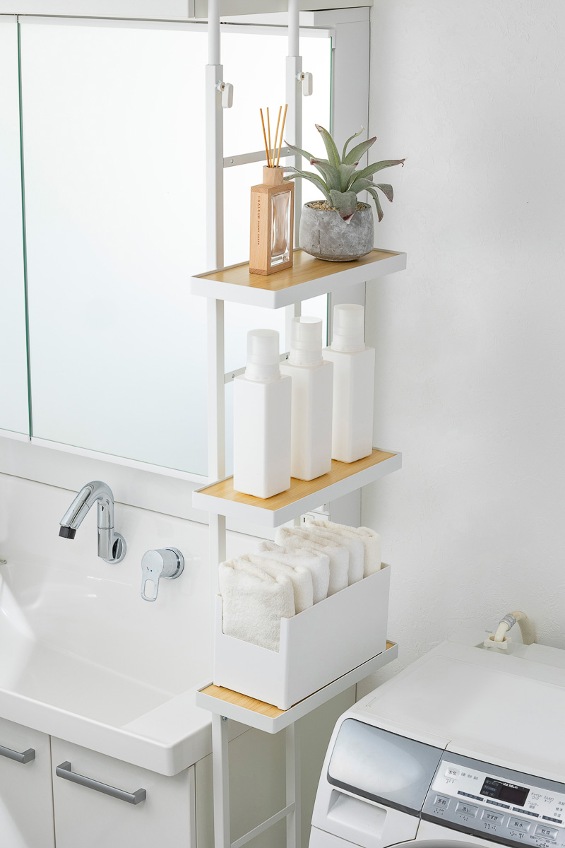 突っ張り棒で固定する収納ラック。洗面台と洗濯機の間など狭い場所やすき間に設置可能なのでデッドスペースを有効活用できる。組み立ては簡単で、棚板の高さも変えられる。